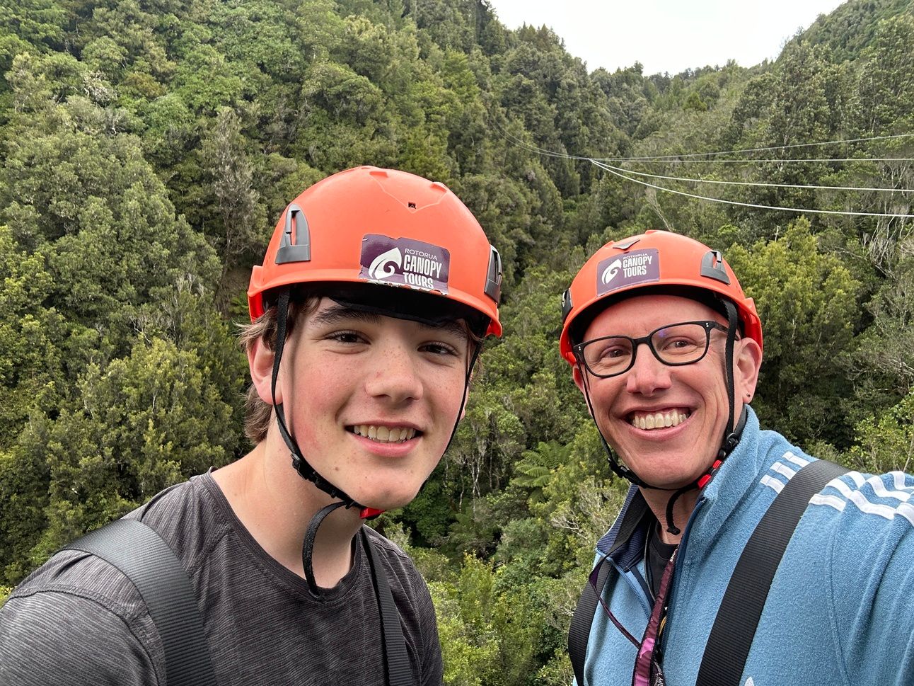 In Rotorua, we booked a zip line course through the forest. At one point, Q and I raced down parallel zip lines — 400 meters, him smiling, me screaming — and of course, me winning. He might have the height but dad has the weight.